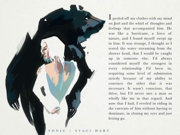If you’ve read a Hart novel before you know that Staci has a way of wrapping you up in the softest blanket while her words break you down and embed themselves deep in your heart and her characters become your friends, people you love, but all the while you know that something will come and blow it all apart taking you down with it. In Tonic, the boom of the bomb she drops is really painful. It’s loud and rips the blanket and your heart to smithereens. And it left me a mess. A total blubbering mess filled with my own anger and desperation. But through the cold, the heat always wins and Staci, piece by piece, put my heart back together, slowly but surely, she made me smile through tears. She made my heart sing through raw devastation and she set my soul ablaze though love.